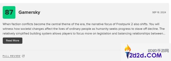 但这套系统虽好,却缺乏足够的深度与让玩家大展拳脚的相应模式。故事的结局来得有些戛然而止,而沙盒模式的可重玩性也相当有限。由于法令与研究明显存在相对最优解,你每轮游戏的体验也不会产生太大差异。如果《冰汽时代2》未来能像前作一样,持续提供给玩家更多的可玩内容,那么它绝对是一款要比现在更为优秀的作品。”