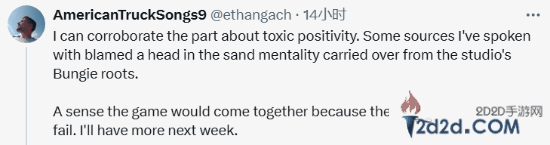 “我可以证实关于“有毒积极性”的部分。我采访过的一些消息人士将这种心态归咎于工作室从Bungie时代传承下来的鸵鸟心态。这种心态认为,因为团队太优秀了,所以游戏肯定会成功。我下周会有更多内容分享。”