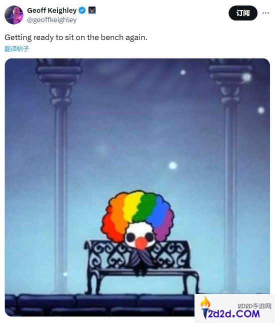“准备再次坐在长凳上”,配图则是小丑脸的《空洞骑士》角色,至于为什么说“再次”,因为之前科隆展前夕Geoff Keighley也发过这张图。