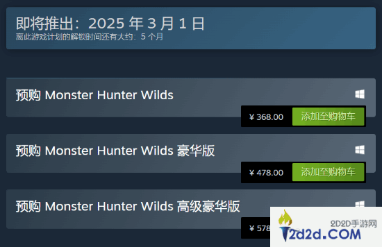 《怪物猎人:荒野》Steam平台预购已开启。国区标准版售价368元,豪华版售价478元,高级豪华版售价578元。2025年3月1日正式推出。
