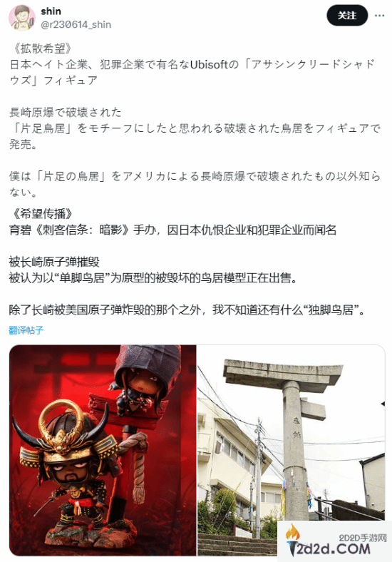 不少日本网友表示,该手办太不尊重日本及其玩家,因为半边的鸟居很容易让人联想起长崎原子弹后遗留下来的山王神社独脚鸟居。