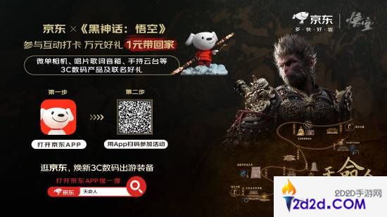 用户可以通过京东APP扫码参与线上互动,有机会赢取京东与《黑神话:悟空》联合推出的限量联名好礼。参与者还能以1元的超低价格,带回联名产品、微单相机、唱片歌词音箱等3C数码装备。