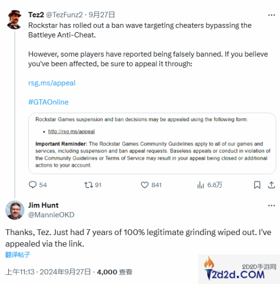 除此之外,知名R星爆料博主Tez2针对被误封的玩家在X发布了R星的申诉链接,有玩家表示:“感谢,我7年的成果已经化为乌有,我已通过链接提出上诉。”