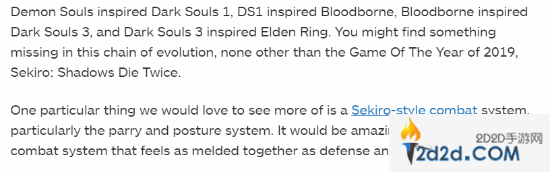 此外,媒体表示FS社很擅长在新作当中重复使用前游戏的元素,逐渐建立了相当完善的系统。其表示希望新作中出现更多类似《只狼》的战斗系统,尤其是格挡和招架的机制,将防御和进攻完美的结合在一起。媒体认为这样可以在既定机制的基础上提供更精致的战斗体验。