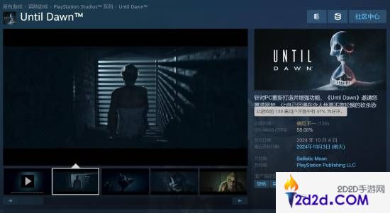 《直到黎明:复刻版》已正式发售,游戏在Steam国区售价398元,需要关联PSN账号。目前游戏评价为“褒贬不一”,收录139篇玩家评价好评率57%。