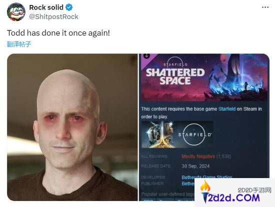 DLC口碑的失利,连带《星空》制作人陶德·霍华德也一起被看乐子的网友群嘲。有博主发表情包讽刺:“陶德又做到了!”