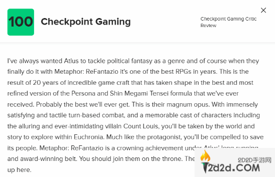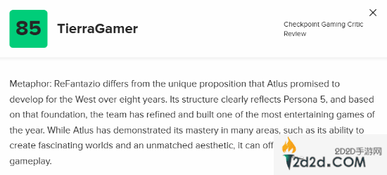 哪怕是给予最低分85分的,也给到了本作高度评价:“《暗喻幻想》结构清晰地继承了《女神异闻录5》,再次基础上完善并打造了本年度最具娱乐性的游戏之一。Atlus在许多领域都展示了其精湛的技艺,如创造迷人世界的能力和无与伦比的美学,但它在游戏性方面还能提供更多。”