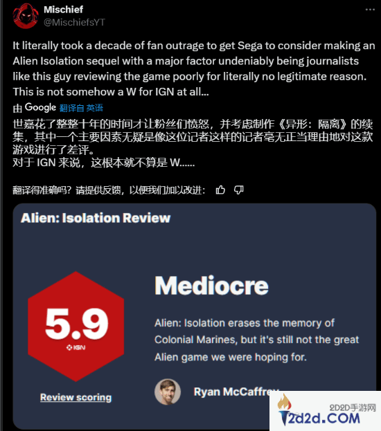 而博主Mischief同样发文回怼:“不可否认的是,像这家伙这样的记者毫无正当理由地对游戏进行差评,是导致世嘉犹豫要不要制作《异形隔离》续集的主要因素。这并不是IGN的胜利。”
