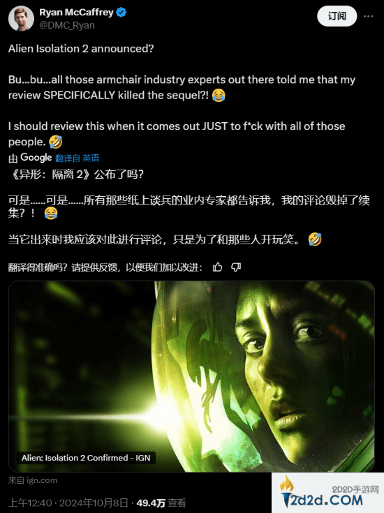 我把续作毁了?当年给《异形隔离》低分的ign编辑"跳脸玩家"