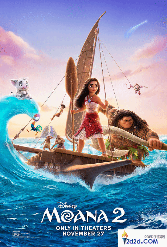 《海洋奇缘2》发布新海报,11月27日北美上映。带着族人的期望,与半神、猪、鸡和椰子海盗一起展开冒险。