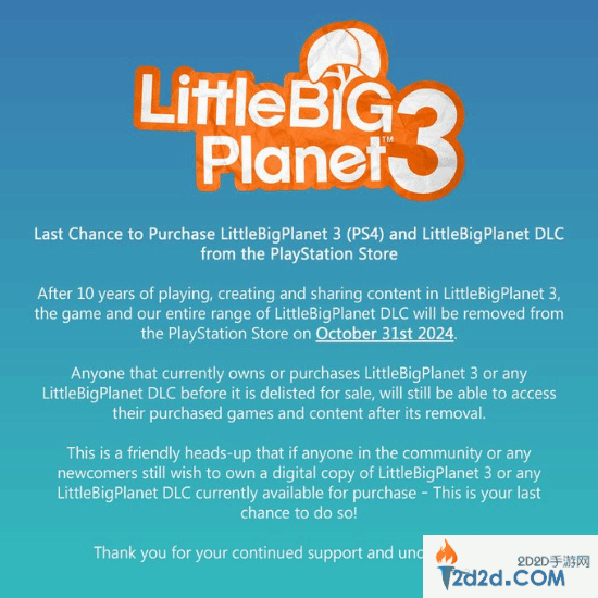 官方在公告中表示:“这是一个友好的提醒,如果社区中的任何人仍然希望拥有《小小大星球3》或任何目前可用的《小小大星球》DLC,这是你最后一次机会。”早在9月,索尼就证实《小小大星球 3》将很快退出其PS Plus订阅服务。