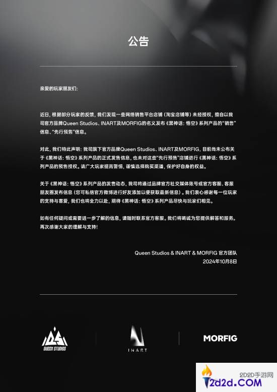 今日,《黑神话:悟空》官方手办工作室INART发布声明,提醒广大玩家,《黑神话》系列产品的正式发售信息尚未公开,警惕网络上未经授权的“先行预售”。