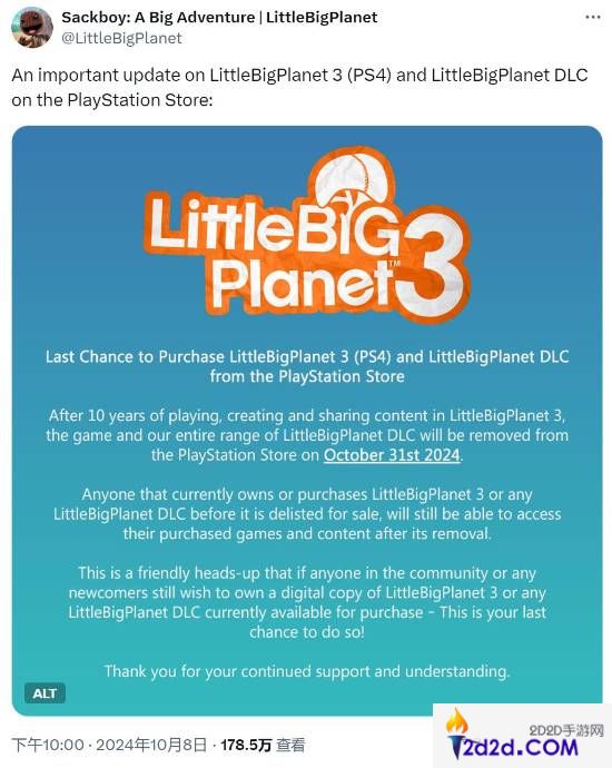 索尼宣布计划将《小小大星球3》从PlayStation Store永久下架。官方表示,PS4版《小小大星球3》将于10月31日永久下架,所有DLC也将随之下架。原因可能是由于多年来黑客攻击造成服务器问题难以解决,难以维持正常的游戏状态。