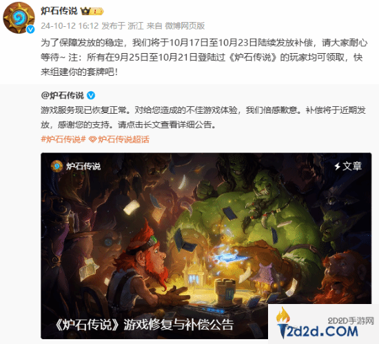 此前,《炉石传说》国服发布修复与补偿公告,补偿50包+1000金币等。
