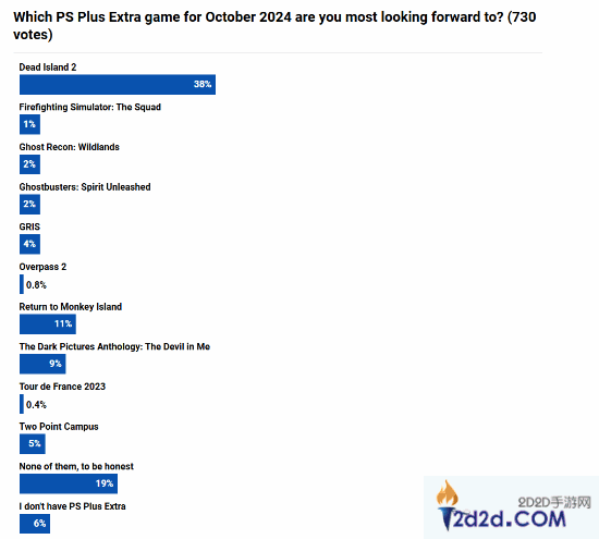 在喜爱的游戏方面,共有730名玩家参与投票,《死亡岛2》以38%的玩家喜爱度断崖领先于其他游戏,第二名为《重返猴岛》,第三名则为《黑相集:心中魔》。