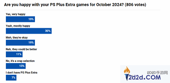 外媒Push Square发起了新一轮满意度投票调查,截至发稿,共有806名玩家参与投票,68%的玩家表示满意新增游戏的质量;11%玩家认为新增游戏应该再好一些;13%的玩家则认为比较差劲。
