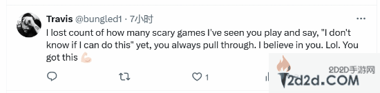 一位网友调侃道:“我都数不清看过你玩多少恐怖游戏时说‘我不知道我还能不能继续’,但你总能坚持下去。我相信你,哈哈。你一定可以做到的。”
