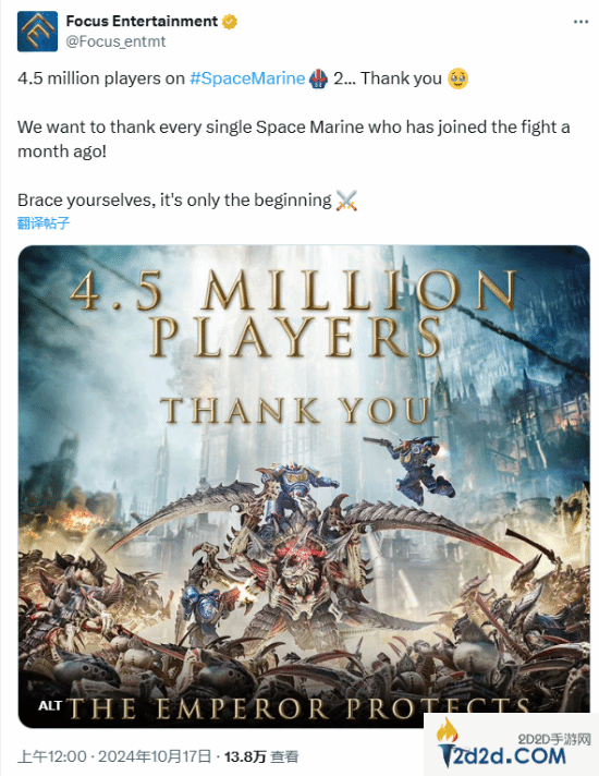 Saber Interactive的第三人称射击作品《战锤40K:星际战士2》已发售一个多月,10月17日,发行商Focus Entertainment在X上发文宣布,《战锤40K:星际战士2》全平台玩家总数已突破450万人。