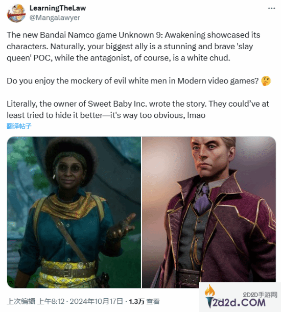 除此之外,因《无名九使:觉醒》里出现了一名白人反派,Mangalawyer再次将游戏里的一名黑人角色与其做了对比,并表示:“你喜欢现代电子游戏里对邪恶白人的嘲讽吗? SBI的创始人亲自编写了游戏故事,他们连藏都懒得藏,实在太明显了。”在评论区里,玩家们也纷纷表示自己喜欢这名白人反派。
