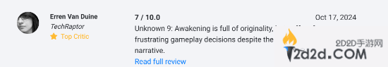TechRaptor表示:“《无名九使:觉醒》充满了原创性,尽管其叙事中的谜团引人入胜,但游戏体验上却受到了一些令人沮丧的决策的影响。”
