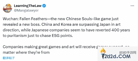 有国外博主在社交平台上发文称:“《明末:渊虚之羽》这款新的中国类魂游戏展示了一个全新的BOSS。现在中国和韩国在艺术设计上已经超越了日本,而日本公司似乎为了追求ESG分数倒退了400年。无论来自哪里,只要公司能制作出伟大的游戏和艺术,都会赢得玩家的支持。”