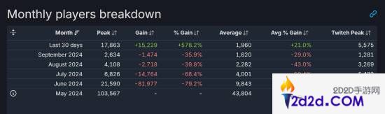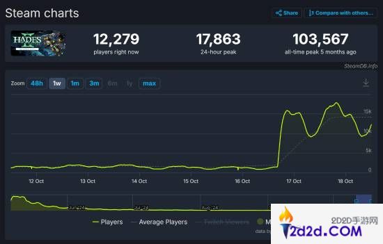 目前《哈迪斯2》在Steam上24小时在线峰值达到17863人。虽然相较今年5月7日“抢先体验”上线时的10万多人峰值有不小差距,但对比更新前那段时间的玩家人数,例如9月份游戏的在线人数峰值为2634人,如今在线玩家数涨幅达578.2%。