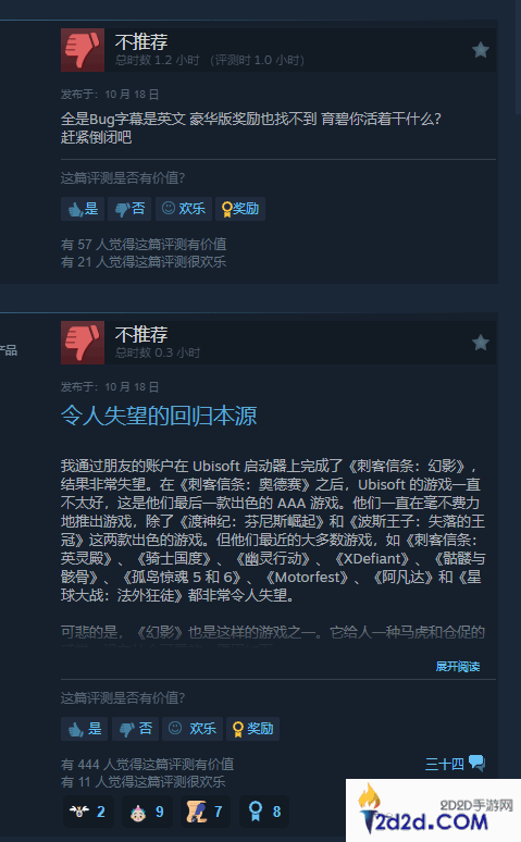 具体评价方面:很多玩家对该系列重回系列经典风格表示满意;而差评则主要集中在游戏的bug、崩溃,以及对当代育碧的抨击。