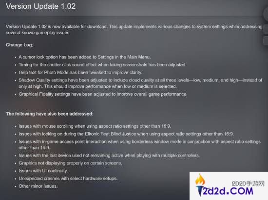 1.02更新除了新增光标锁定选项和改进的拍照模式帮助文本外,还包括光影质量设置改进(云层质量现在有低、中、高三个选项,可以提升性能)。此外,画面保真度设置也经过调整以提升整体性能。