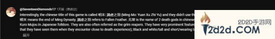 与此同时,评论区也有网友科普称《明末:渊虚之羽》是一款名副其实的类魂游戏,官方就曾以该类型作为宣传口号。此外,有玩家表示WUCHANG对应了游戏中的女主“无常”,而无常在中国神话里还是黑白无常鬼两个死神的名字,进而猜测预告开篇和结尾出现的反派的形象似乎就是基于无常鬼的设计。不少国外玩家还表示继体验过《黑神话》之后,愿意了解类似的中国神话故事,并称赞这些设定相当有趣。