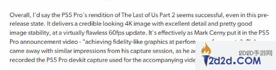 数毛社表示,对于《最后生还者2 复刻版》这款游戏来说, PS5 Pro以几乎完美的60FPS速度,呈现出具有出色细节和相当好图像稳定性的4K图像,打个比方来说,就好像在性能模式下展示出了高保真模式的图形效果。