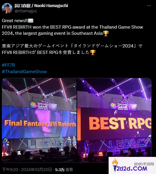 在最近的2024年泰国游戏大展Thailand Game Show上,《黑神话:悟空》《最终幻想7:重生》等游戏获得了不同类别的年度最佳游戏称号。随后《最终幻想7:重生》制作人滨口直树在推特发文感谢自己的游戏在该展获“最佳RPG”奖项,间接证明了这个“TGA”(泰国游戏大奖名为Thailand Game Awards)的“含金量”。