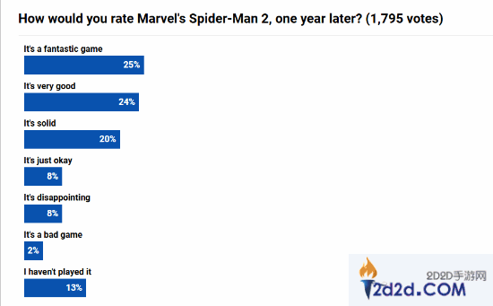 日前,外媒Push Square再次针对《漫威蜘蛛侠2》重新发起了一次原版PS5版本的玩家评价,截至发稿前,共有1795张投票,近70%的玩家认为《漫威蜘蛛侠2》是一款非常精彩的游戏,仅有10%的玩家对《漫威蜘蛛侠2》表示不满意。