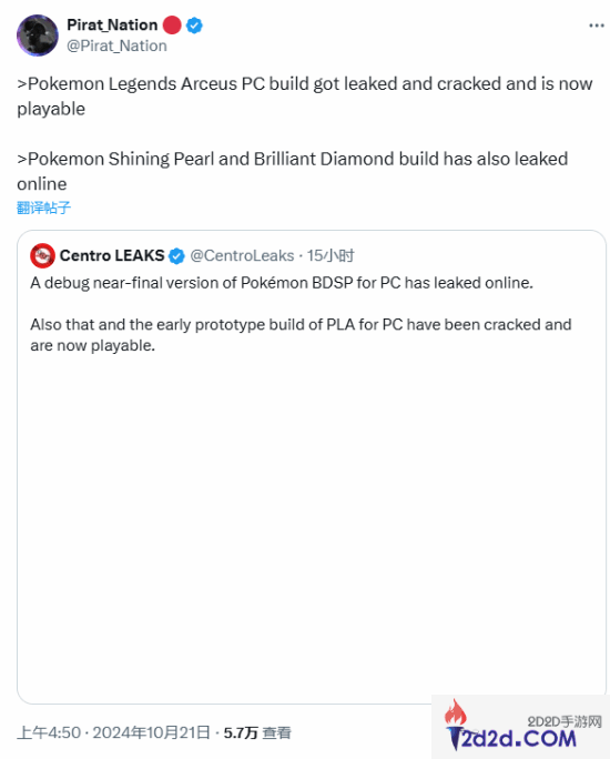 据推主Pirat_Nation援引另一位推主Centro LEAKS的消息报道,《宝可梦:阿尔宙斯》的PC版本(接近于最终版本)被泄漏且已被破解,处于可玩状态。除此之外,《宝可梦 晶灿钻石·明亮珍珠》的PC早期原型版本已被破解,也处于可玩状态。