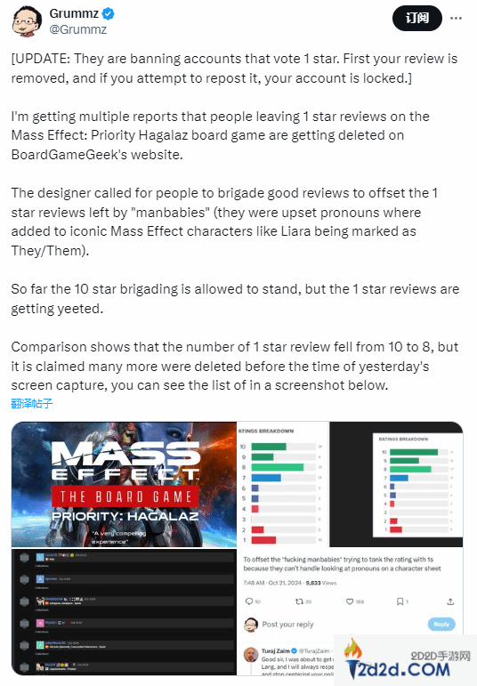 知名的反ZZZQ老哥Grummz也注意到了此事,而据他的观察,官方已经开始封禁给《质量效应》桌游刷1星差评的账户,证据之一就是1星差评已经从昨天的10条凭空减少至8条。