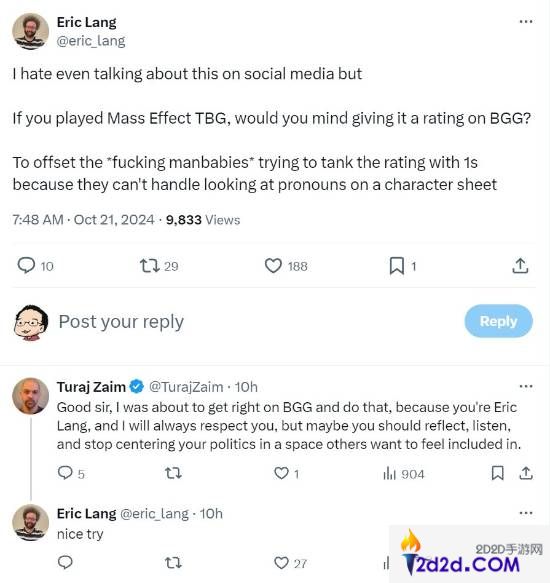《质量效应》桌游已在一个多月前发售,但本作首席设计师Eric M. Lang的一则推文让不少许多不玩桌游的玩家也开始关注到了它:“我讨厌在社交媒体上谈论这个话题,但是如果你玩过《质量效应》桌游,你介意在BGG上给它打个分吗?以抵消那些因为无法忍受角色表上的人称代词而试图用1星刷分的‘男宝(manbabies)’带来的影响。”