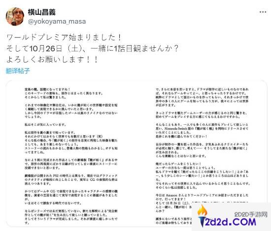 此前我们报道了Prime Video发布的《如龙》真人剧预告中,桐生一马口中说出了“我想成为堂岛之龙”这句话,引发游戏粉丝不满,很多人开始批评真人剧的改编。而如龙工作室制作人横山昌义最近也发推谈到此事,表示真人剧确实和游戏版有所不同。