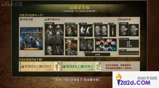 在今晚举办的《怪物猎人:荒野》发布会上,卡普空官方除了发布最新宣传片以外,还公布了本作的预购特典内容,其中预购了高级豪华版的玩家除了游戏本体外,还将获得独特的角色外观、随从外观、鹭鹰龙装饰以及各种肢体动作,发型等。在游戏发售后还将陆续获得两款“装扮DLC组合包”。
