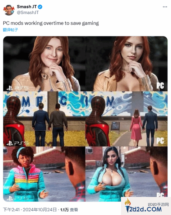 日前,推主SmashJT发推,引用了一张恶搞对比图来谈论《漫威蜘蛛侠2》的PC版本。SmashJT调侃道:“PC的MOD将会加班加点的来拯救游戏。”