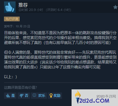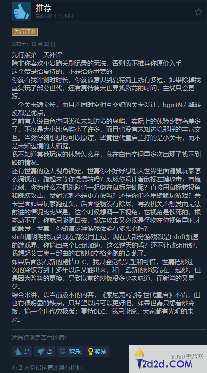 给出好评的玩家表示,《索尼克×夏特 世代重启》最主要的优点就是关卡设计,剧情与配乐等也比较不错,但也有部分缺点,例如内容量少、操作冲突等。