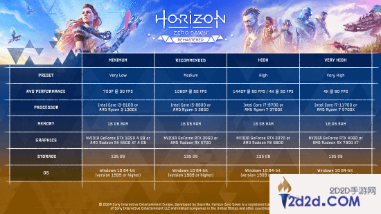 《地平线:零之曙光复刻版》即将于下周发布,今日官方公布了游戏的PC配置。最低(720P/30FPS)要求GTX 1650显卡+16GB内存,推荐(1080P/60FPS)使用RTX 3060显卡+16GB内存。需要预留135GB的存储空间。
