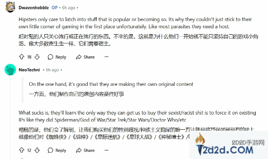 一位玩家表示:“他们最终会发现,唯一让我们支持这些具有性别或种族偏见内容的方式,就是将其强行植入已有的热门IP,如《蜘蛛侠》《战神》《星际迷航》《星球大战》等。”