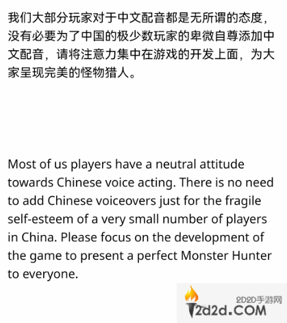 这位玩家表示:“我们大部分玩家对于中文配音都是无所谓的态度,没有必要为了中国的极少数玩家的卑微自尊添加中文配音,请将注意力集中在游戏的开发上面,为大家呈现完美的怪物猎人。”