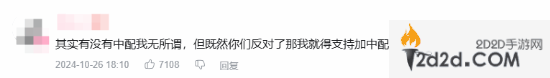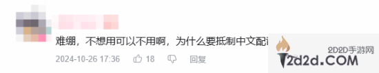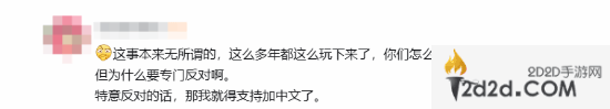 有玩家表示疑惑:“难绷,不想用可以不用啊,为什么要抵制中文配音呢?”还有玩家愤慨说道:“其实有没有中配我无所谓,但既然你们反对了那我就得支持加中配了。”“真是见了鬼了,专门跑到人家下边请愿不要有中配,真是跪久了就站不起来了,不喜欢中配觉得不好不用就行了,为什么要干涉别人的愿望,难道要求中配还有错了吗?”
