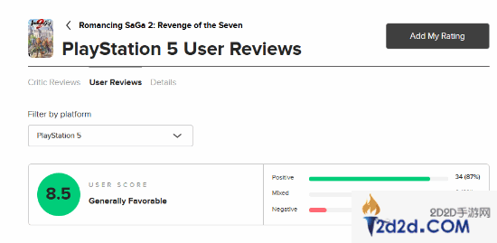 经典JRPG《浪漫沙加2》的完全重制版《浪漫沙加2:七英雄的复仇》现已正式发售,游戏在M站的玩家评分也正式出炉,截至发稿前为8.5分。其中暂时共有近四十名玩家参与了评分,34名玩家给出了好评,5位玩家给出差评。