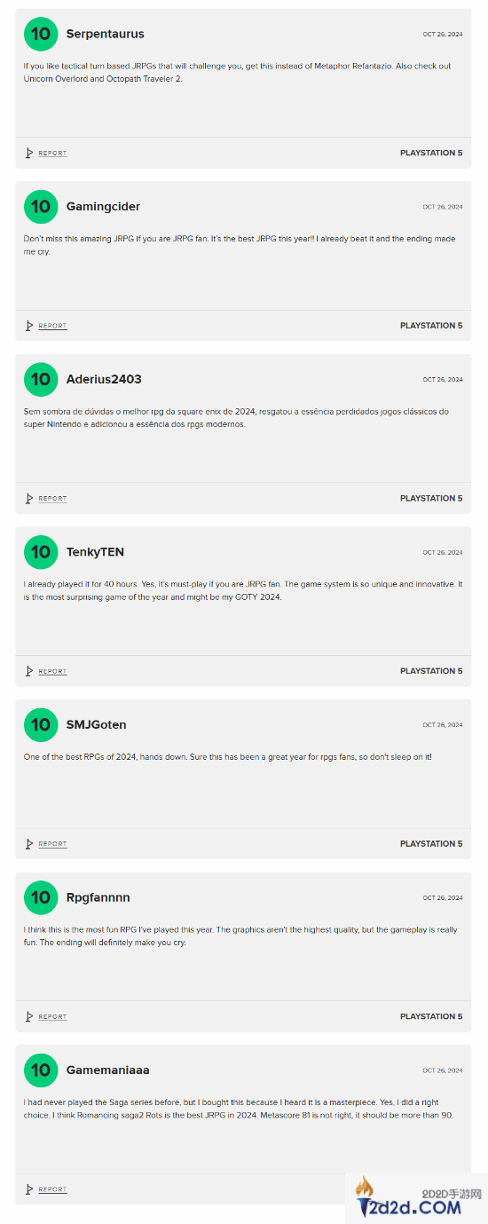 给出好评的玩家表示《浪漫沙加2:七英雄的复仇》是自己今年玩过最有趣且是最棒的RPG游戏,尽管画面的质量不是最高档,但游戏玩法真的很有趣。值得一提的是,这些玩家都给游戏打了10分。