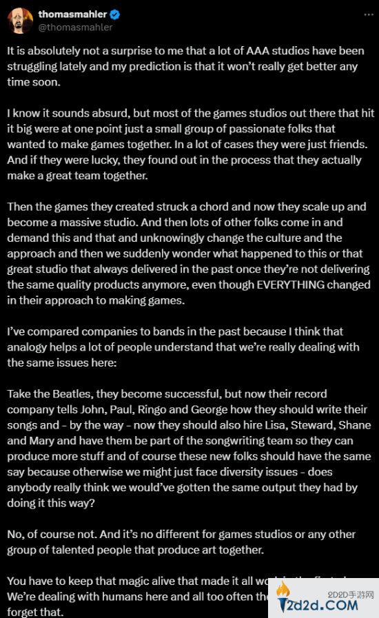 而现在,以当年的披头士乐队为例,假如他们取得成功之后,唱片公司开始教他们怎么写歌,甚至要求许多新人歌手加入,以保持“多元性”。这样产出会高吗?当然不可能,对于游戏工作室或任何其他才华横溢的人来说也不例外。