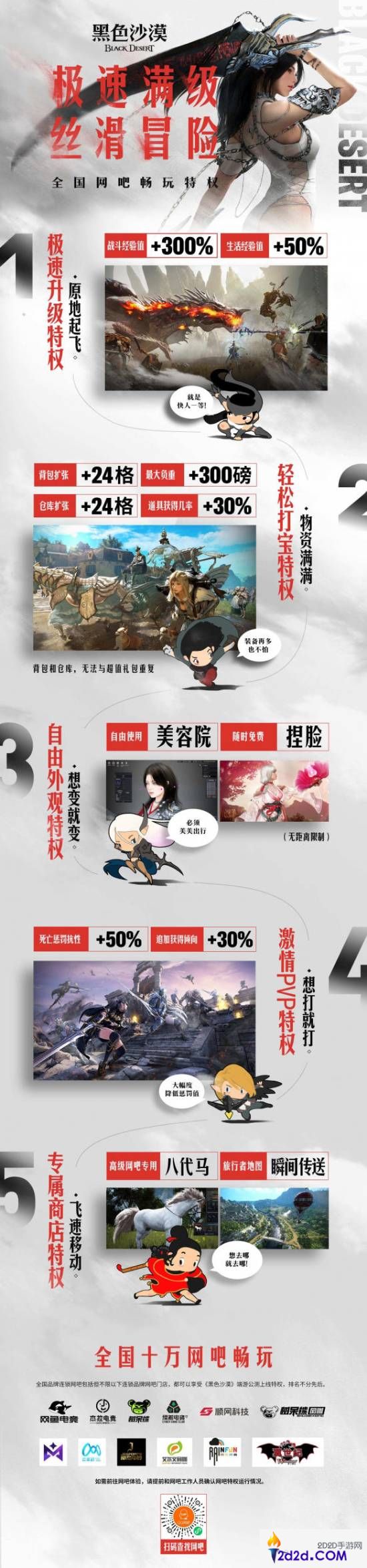 另外,官方还公开了本作的网吧三倍经验活动,公测开启后,前往制定网吧登录《黑色沙漠》,玩家即可获得经验增益、更多背包与仓库储存空间、更高的道具获得几率等等各种专属增益。