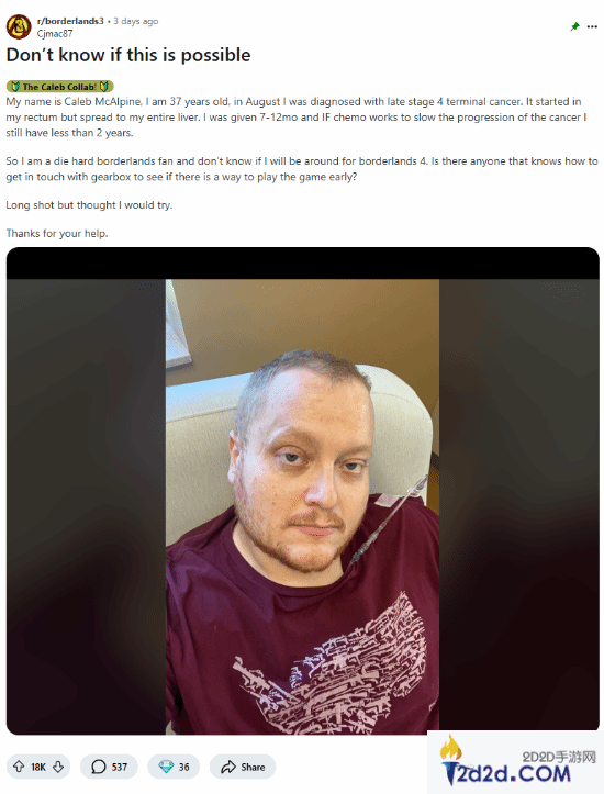 此前报道,一位名为Caleb McAlpine的《无主之地》系列铁杆粉丝在Reddit社区中分享了自己的病情,医生估计他的生命仅剩7至12个月,最乐观的情况也只有不到两年,McAlpine表示自己可能无缘看到计划在2025年发布的《无主之地4》,并想提前体验这款游戏。随后Gearbox公司的CEO Randy Pitchford联系到了McAlpine,并表示会尽最大努力让McAlpine的愿望成真。