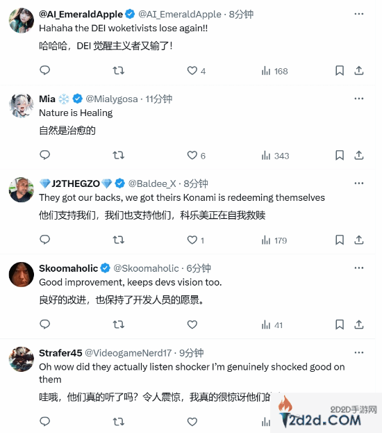 这一变化迅速引发了网友热议。部分网友积极评价此次调整,有人留言道:“这才是正常的女性外观!”“哈哈,‘觉醒活动家’又输了!”“科乐美挺我们,我们也挺他们,这才是赢回玩家信任的路。”甚至有玩家认为此调整不但迎合了玩家审美,还“符合开发者的原始设想”。