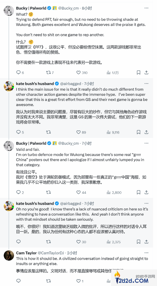 随后,@airbagged进一步解释称:“对我而言,《悟空》尽管宣传力度很大,但在角色动作游戏中并没有太多创新。不过我明确表示过,这对Game Science(黑神话开发团队)来说是个很棒的开端,他们的下一款作品会更精彩。”@Bucky_cm理解地回应称:“你的观点合理,我对《悟空》防卫心切,因为网上有些人明显带有‘对中国的偏见’。抱歉我差点误解了你。”